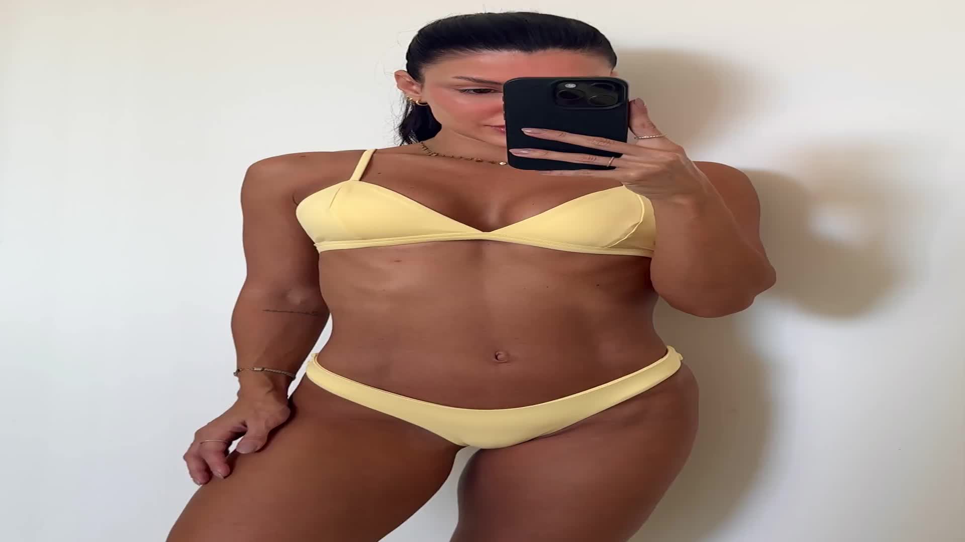 nas fotos a modelo Nágela veste top M e calcinha P